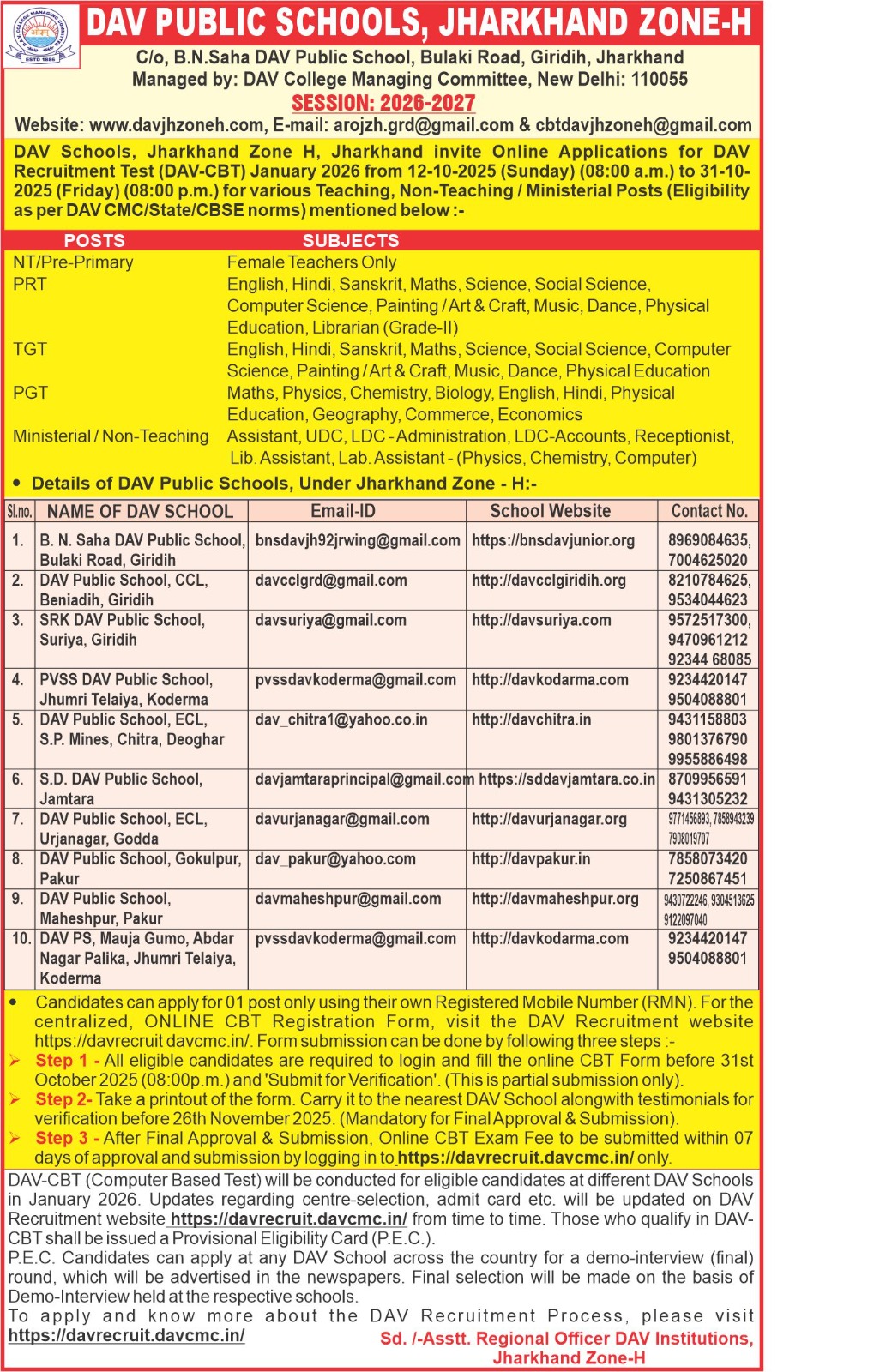 D.A.V Public Schools, Jharkhand Zone - H invite Online Applications for CBT - 2026 (DAV RECRUITMENT - 2026)